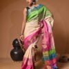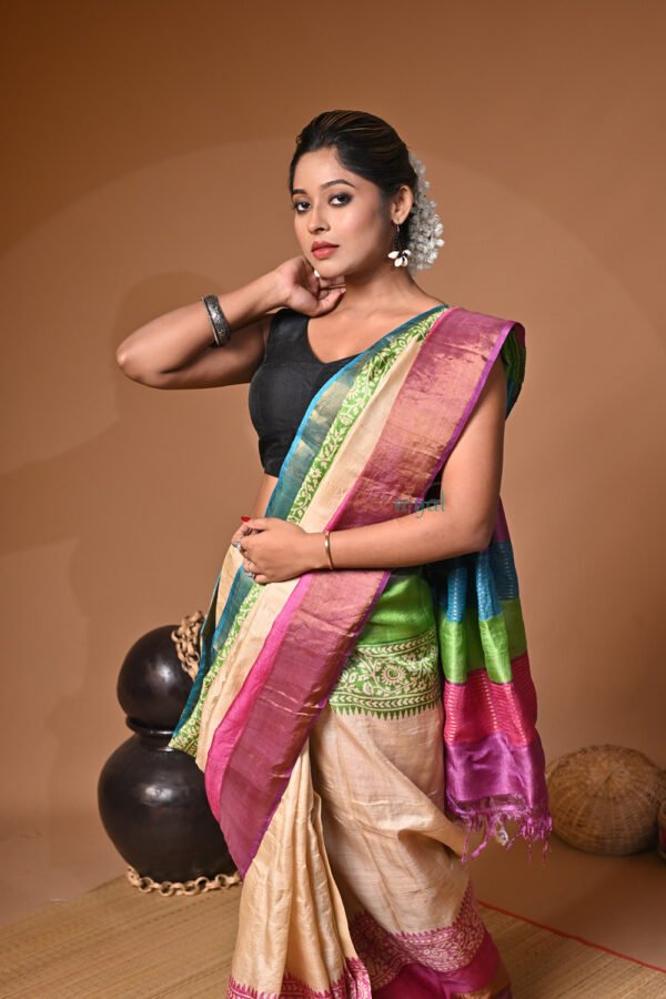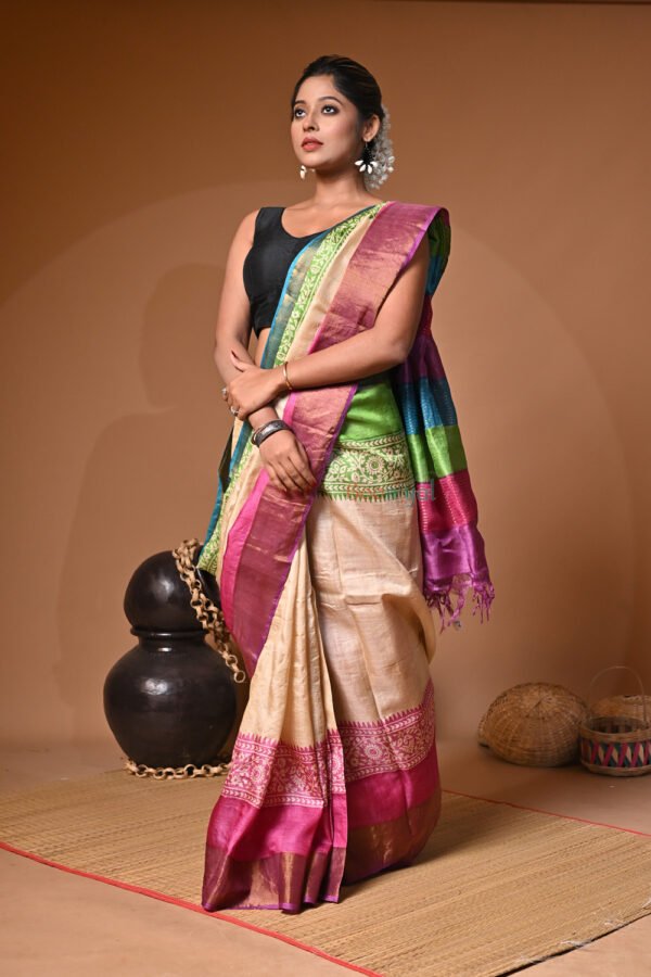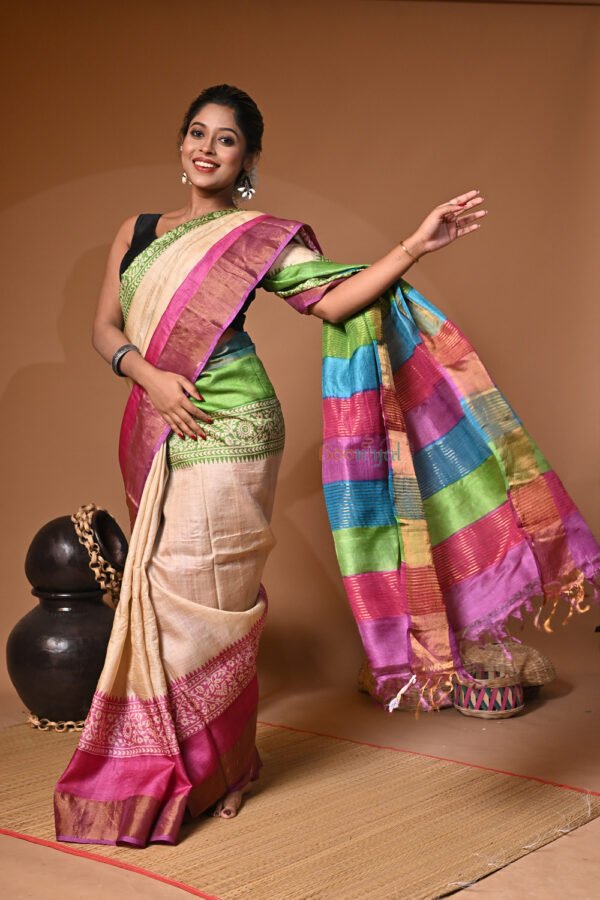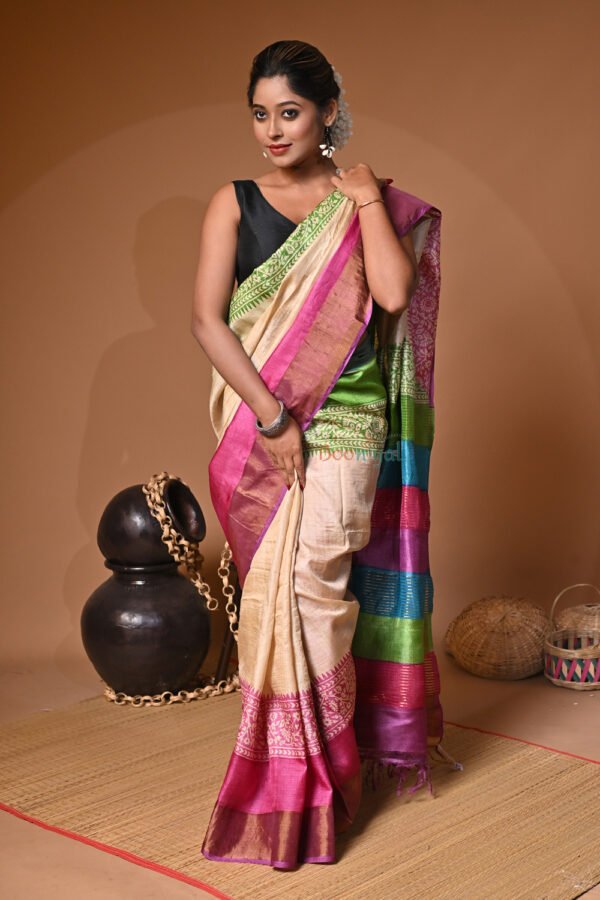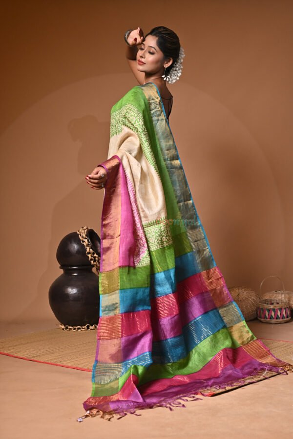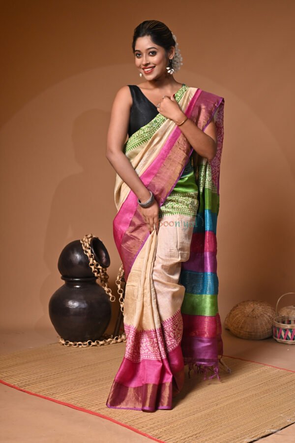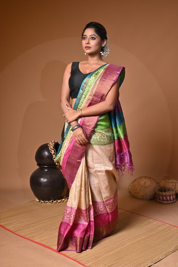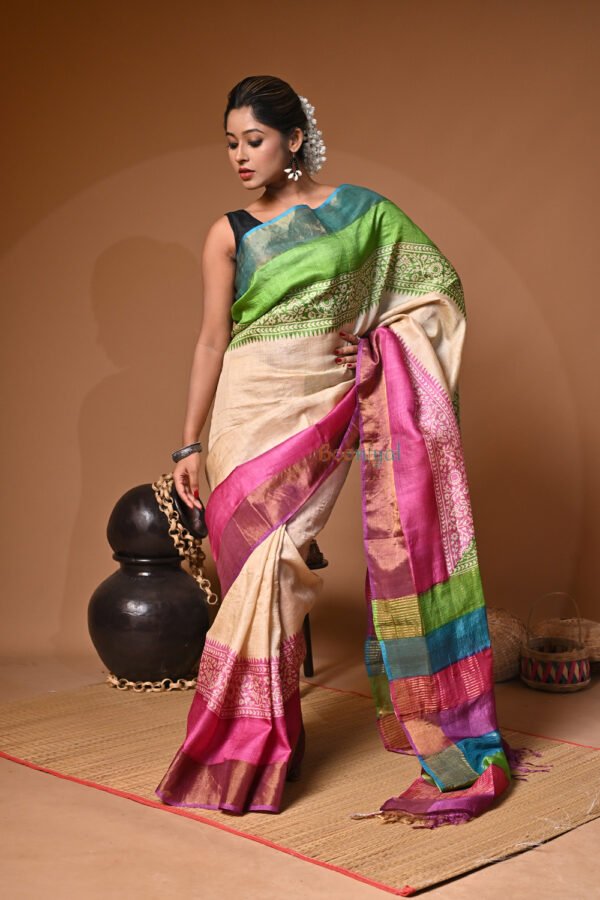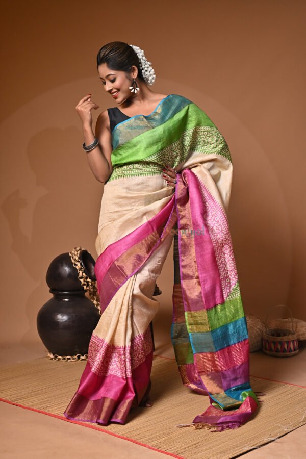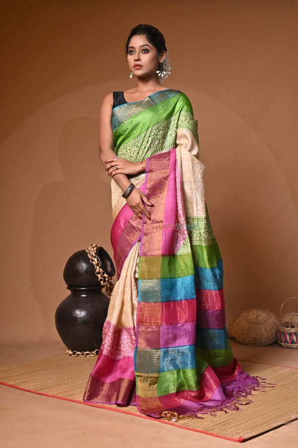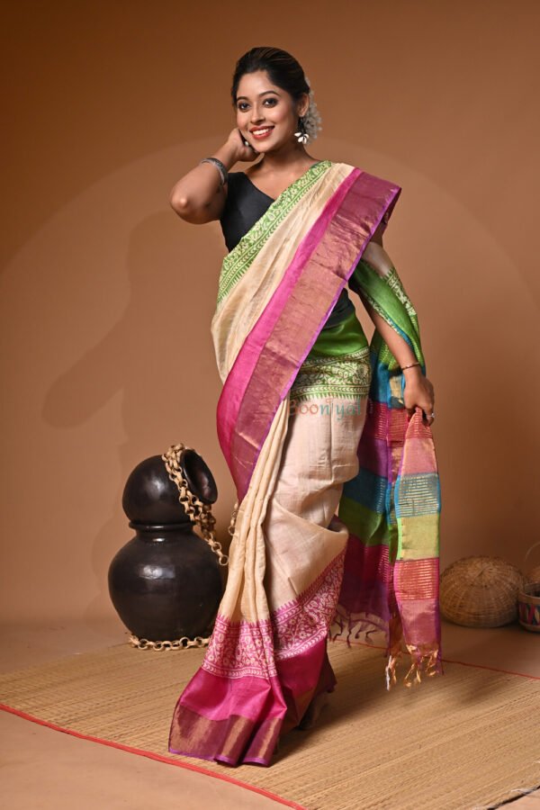 Handblock Print Pure Bushnupuri Zariborder Tussar Saree – Silk Mark Certifie