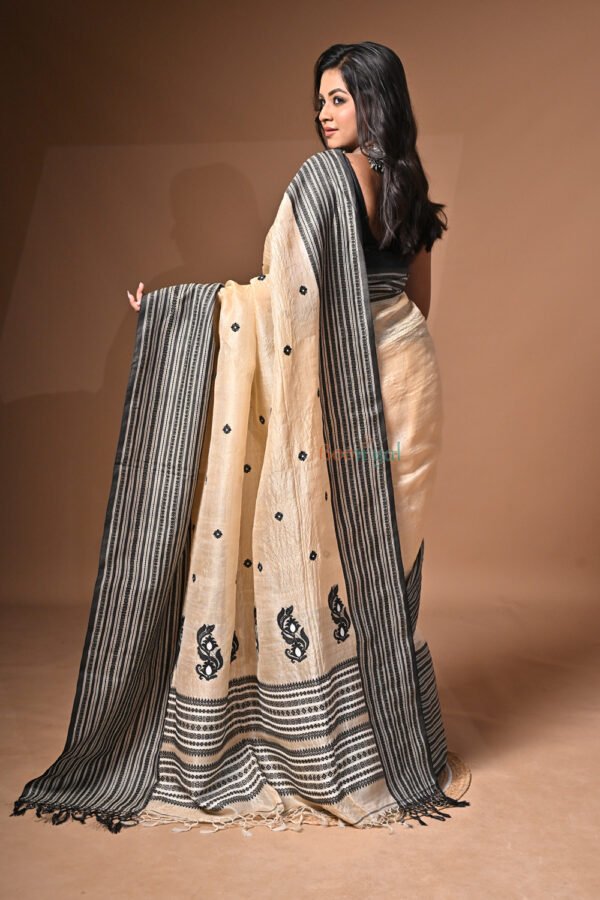 Step into timeless elegance with Booniyal Boutique’s Pure Tussar Saree, adorned with exquisite Jamdani weaving – a rare blend of Bengal’s textile heritage and modern sophistication.