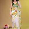 The Artistry The highlight of this drape is the breathtaking hand-painted artwork. Large, cheerful yellow sunflowers with lush green foliage cascade down the pallu and pleats, popping vividly against the soft white background. Each brushstroke captures the organic beauty of nature, ensuring that no two sarees are exactly alike.