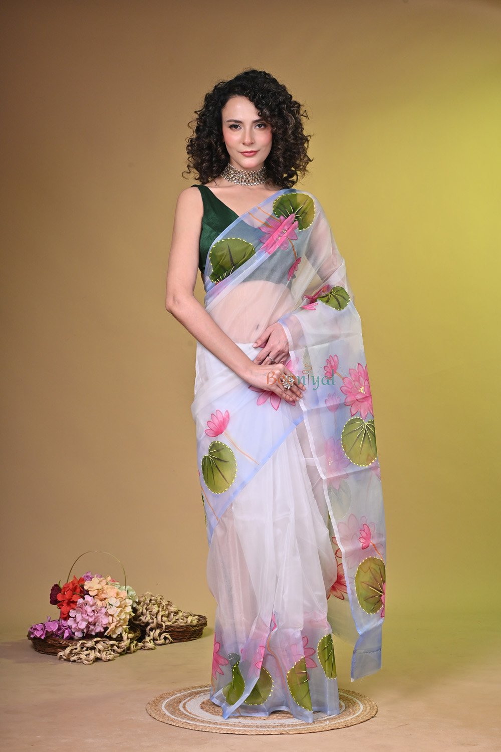 Radiate the joy of summer with this exquisite Handpainted Organza Saree by Booniyal. Crafted from feather-light, sheer organza, this saree features vibrant, hand-painted sunflowers that bloom across a pristine white canvas. Finished with a delicate yellow border, it is the perfect drape for garden parties, summer weddings, and elegant daytime soirees.